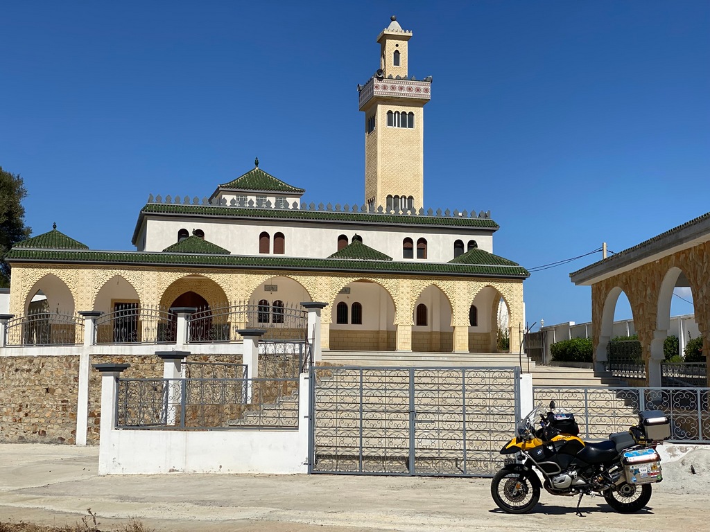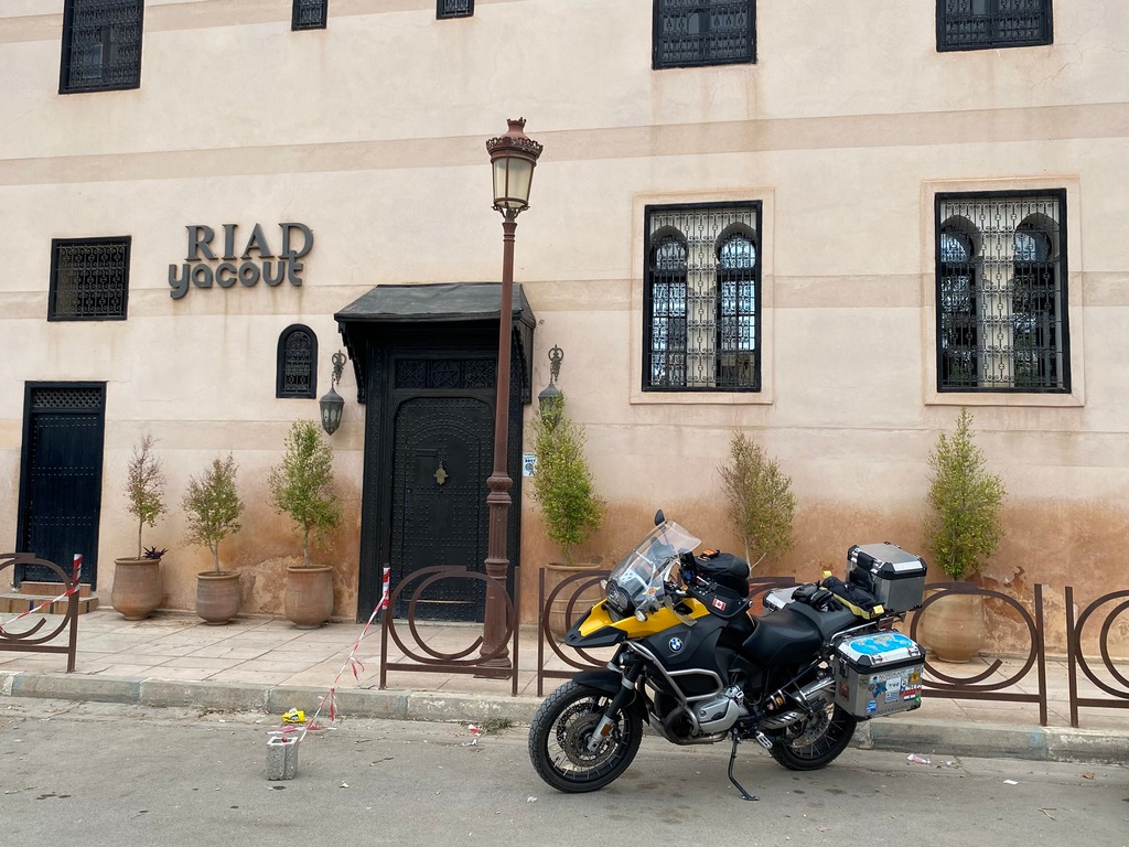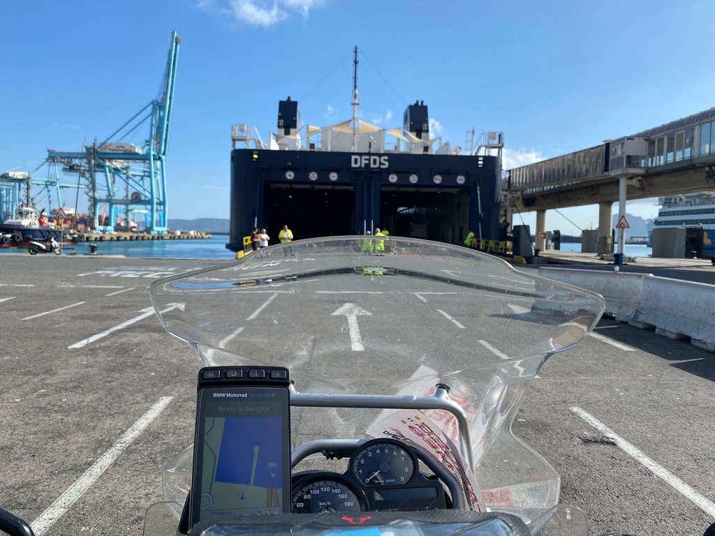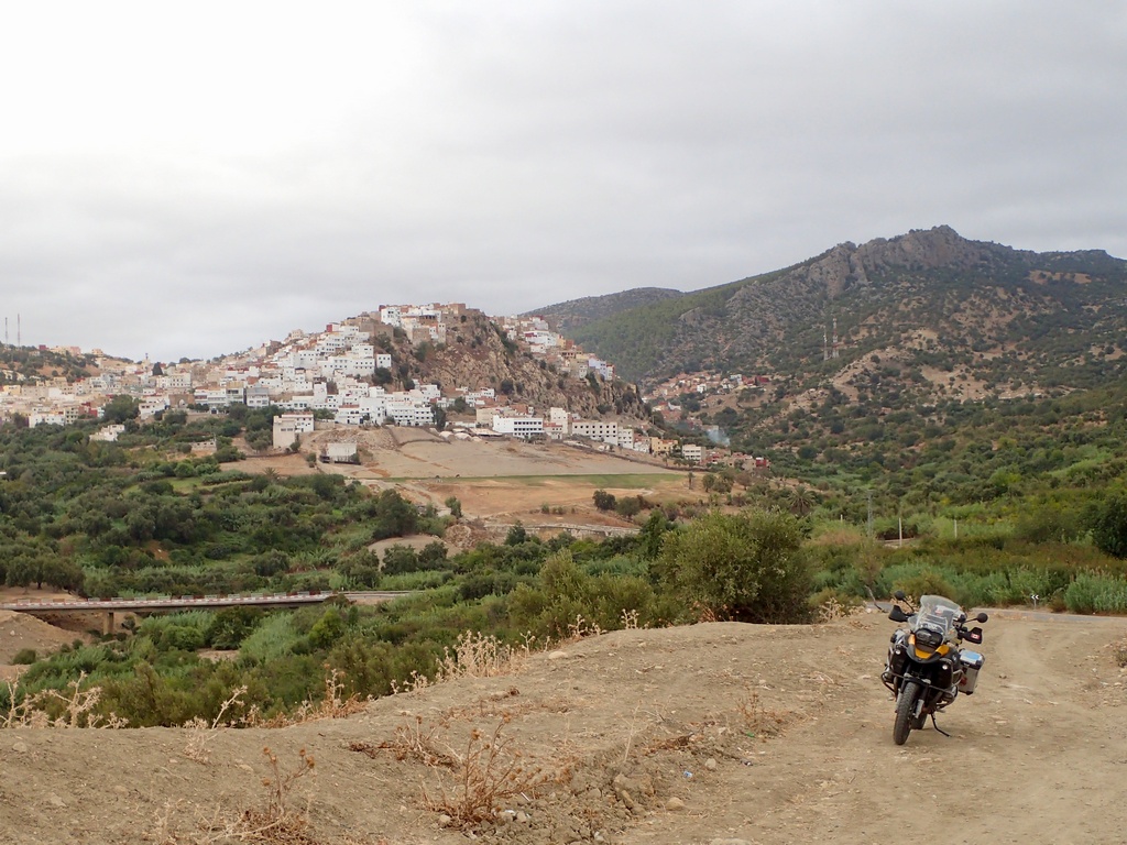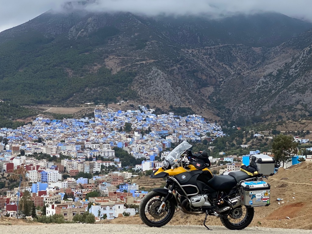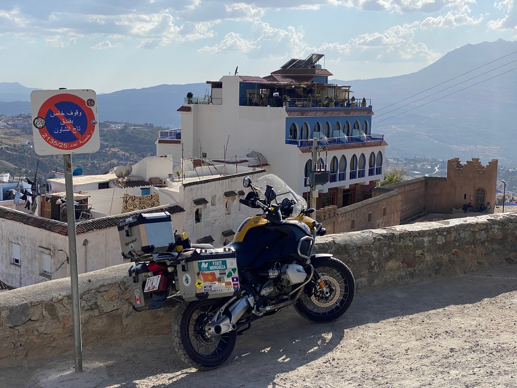 To Morocco! It was an uneventful crossing of the Straits of Gibraltar to Tangier Med on Friday. Passport control was done right on the ship so only the customs inspection needed to be done when we landed. I was first off the boat and rode about a kilometre to the empty customs booths. An official looked at the map on my saddlebag and said something about a problem. He called someone else over who said I have to remove the map. What? The map with my GPS tracks showed a dotted line in Morocco for the Western Sahara, or as the official called it, Moroccan Sahara. Ah. I started to peel it off but then he said if I had a knife, I could just cut away the offending portion. I did have a knife with me so cut Morocco out and that seemed to satisfy him. Leaving the port, I was on a divided highway for about 3 kilometres when the GPS turned me off at a small village and then onto a dirt road through town, just as people were leaving Friday prayers. After dodging worshippers, I came to a tiny, but paved, road that went straight up into mountains. This was fantastic riding and exactly what I had been dreaming of when I thought of riding in Morocco. 20 kilometres later I turned right onto a larger road (it had a line down the middle) that eventually took me to Chefchaouen and the Taj Chefchaouen Luxury Hotel & Spa. This new hotel was built just inside the old city wall, high on a cliff with the most spectacular views of “the Blue City”. At the front desk I was treated like a celebrity and the clerk said I am famous. “You are from Calgary on the motorcycle!” Apparently, they had Googled me when they saw the reservation. After a tour of the hotel, I quickly determined I needed to stay another night. I may not make it to Dakar.