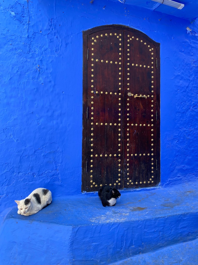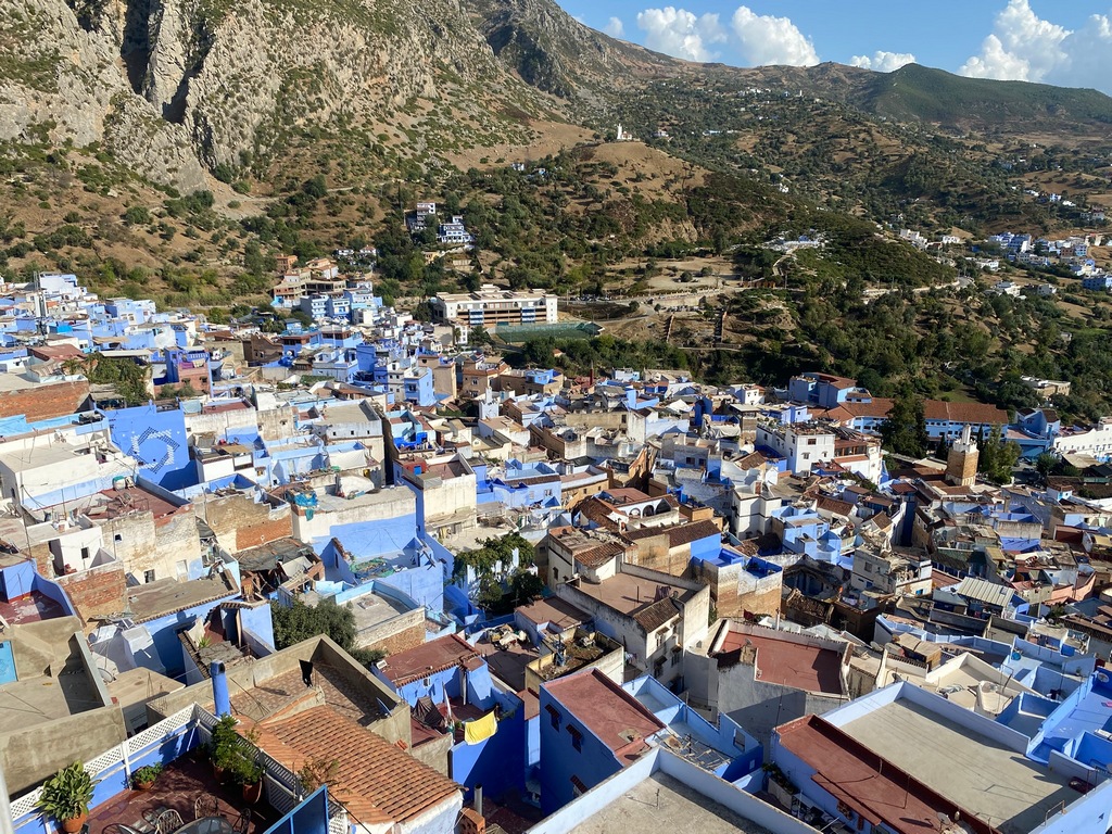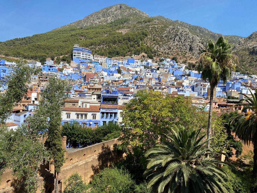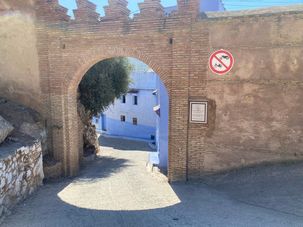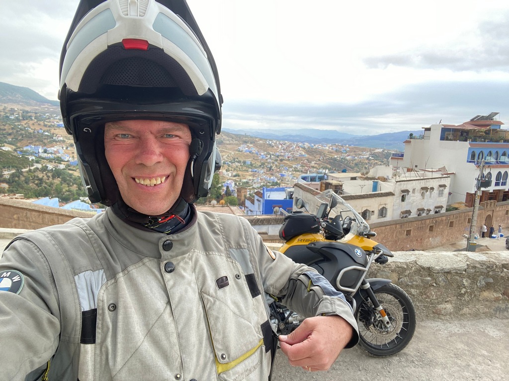 To Morocco! It was an uneventful crossing of the Straits of Gibraltar to Tangier Med on Friday. Passport control was done right on the ship so only the customs inspection needed to be done when we landed. I was first off the boat and rode about a kilometre to the empty customs booths. An official looked at the map on my saddlebag and said something about a problem. He called someone else over who said I have to remove the map. What? The map with my GPS tracks showed a dotted line in Morocco for the Western Sahara, or as the official called it, Moroccan Sahara. Ah. I started to peel it off but then he said if I had a knife, I could just cut away the offending portion. I did have a knife with me so cut Morocco out and that seemed to satisfy him. Leaving the port, I was on a divided highway for about 3 kilometres when the GPS turned me off at a small village and then onto a dirt road through town, just as people were leaving Friday prayers. After dodging worshippers, I came to a tiny, but paved, road that went straight up into mountains. This was fantastic riding and exactly what I had been dreaming of when I thought of riding in Morocco. 20 kilometres later I turned right onto a larger road (it had a line down the middle) that eventually took me to Chefchaouen and the Taj Chefchaouen Luxury Hotel & Spa. This new hotel was built just inside the old city wall, high on a cliff with the most spectacular views of “the Blue City”. At the front desk I was treated like a celebrity and the clerk said I am famous. “You are from Calgary on the motorcycle!” Apparently, they had Googled me when they saw the reservation. After a tour of the hotel, I quickly determined I needed to stay another night. I may not make it to Dakar.