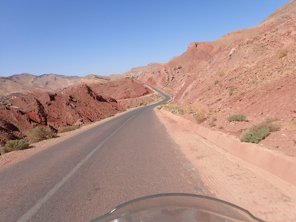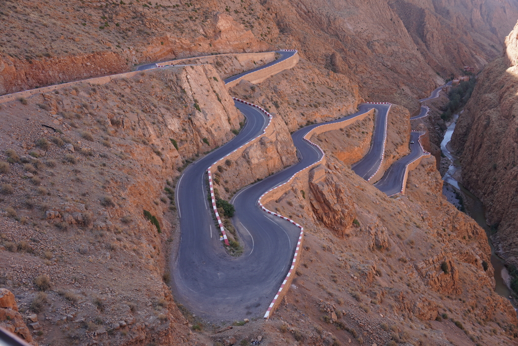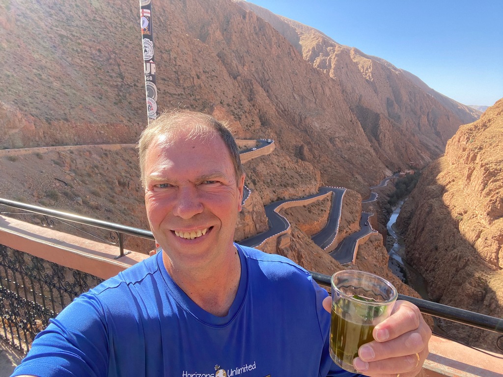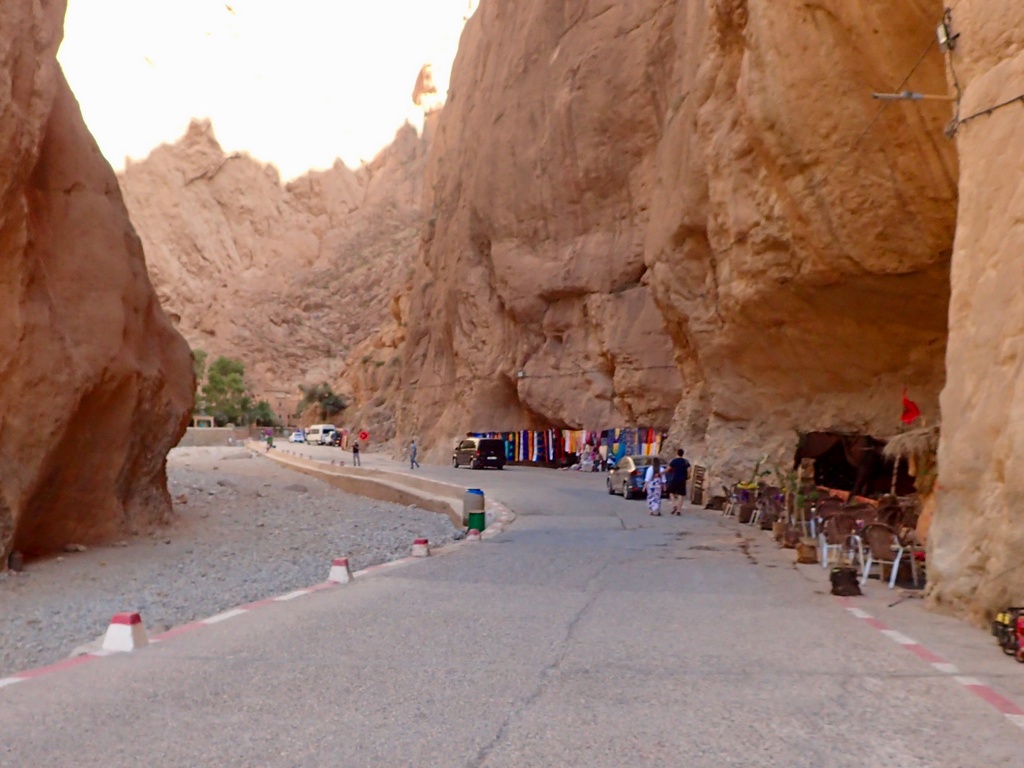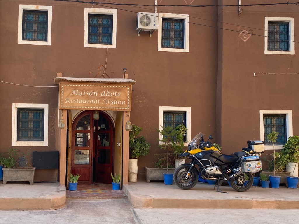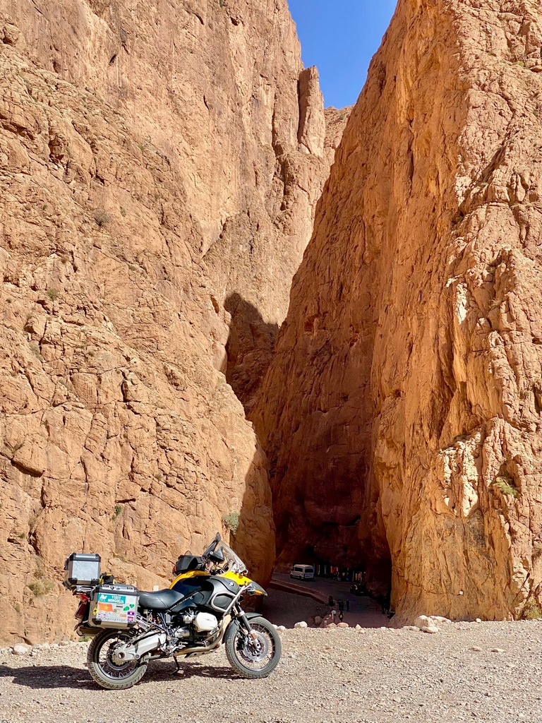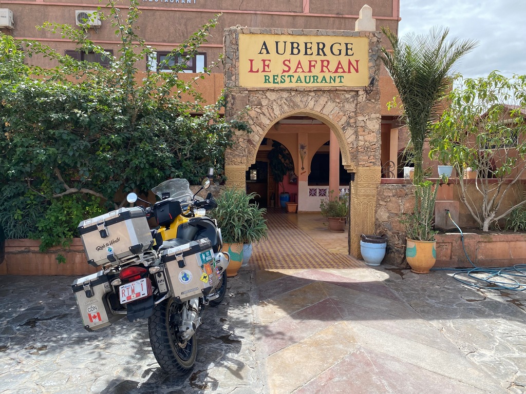 It was only a 2.5 hour ride from Meknes the Dar Zayane hotel outside of the town of Khenifra on Monday so I had a late start and took my time. I am sure a hotel out of town would be nice if you were on vacation and wanted to relax but for me it was just a bit boring as I like to go for a walk around town at supper time. Fortunately, I had stopped for lunch at the Hug Cafe and had a Nutella a crepe so got a bit of people watching in anyway. The Hug Cafe had it nailed down for the Nutella crepe as there was so much Nutella you couldn’t see the crepe. Perfect. Tuesday I rode towards the Todra Gorge via Imilchill in the High Atlas Mountains, topping out at Col de Tizi Tigherrhouzine at 2645m. Even Imilchill was at about 2,000 metres and I really enjoyed the ride with its sweeping corners. Then a steady down, culminating in the Todra Gorge. This gorge is really narrow, reminding me of the canyon coming out of Radium on Highway 93 in B.C. It would be really neat if it wasn’t crowded with souvenir sellers and tourists walking in the middle of the road but alas that wasn’t the case. It was another 100 km to my hotel at the base of the Dadès Gorge. There were lots of motorbikes today, even a group of Harley Davidson riders with Eagle Rider. I think I saw the same group of about 8 fancy adventure touring bikes (no luggage) twice. I suspect they were doing the Todra and Dadès gorges loop in a counterclockwise direction from a base in Dadès while I was going clockwise. I took a short trip up the famous switchbacks of the Dadès Gorge before backtracking to the hotel. I will take the Insta360 tomorrow morning to do some video. The host at the Maison d’Hote Argana was very friendly and welcoming. We sat out on the balcony with tea and cookies while filling in the appropriate paperwork before he showed me to my room with its own balcony overlooking the garden and Dadès River. A day of gorgeous gorges.Leaving through the gates that are part of the wall where the riad is located