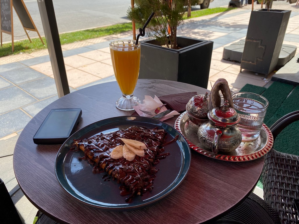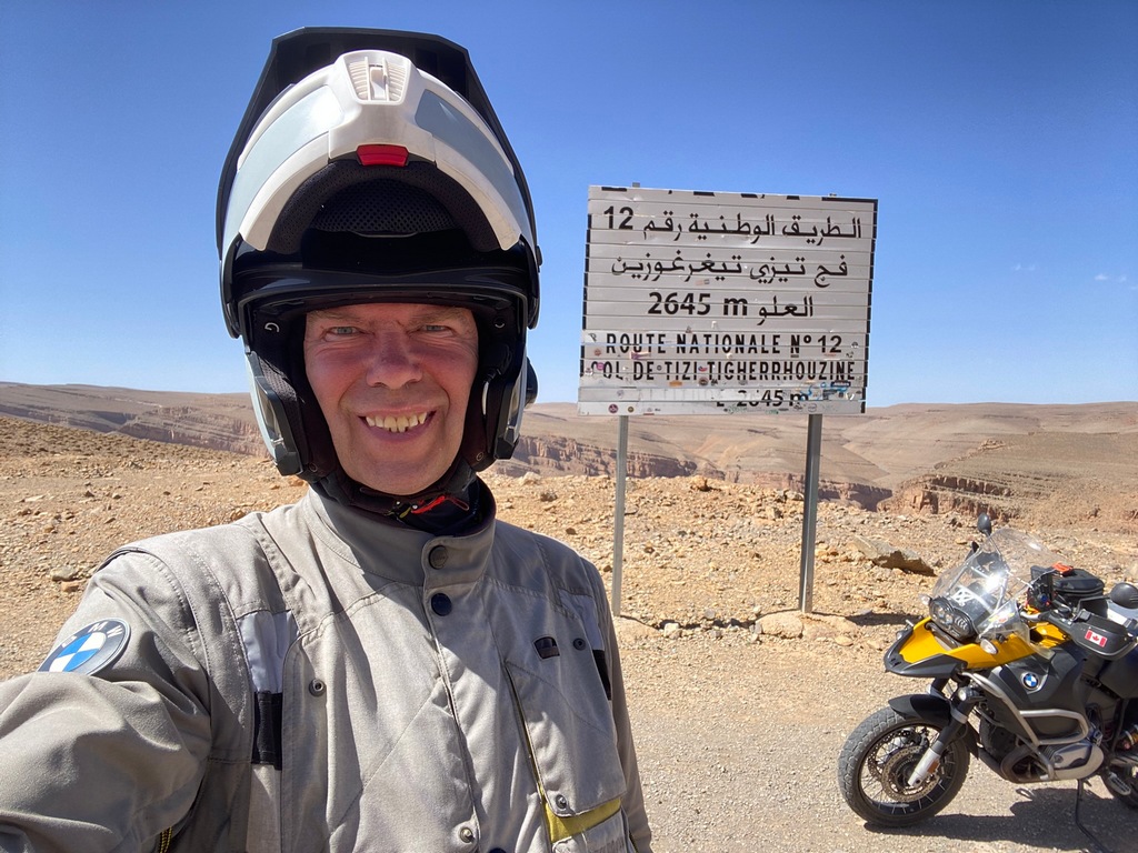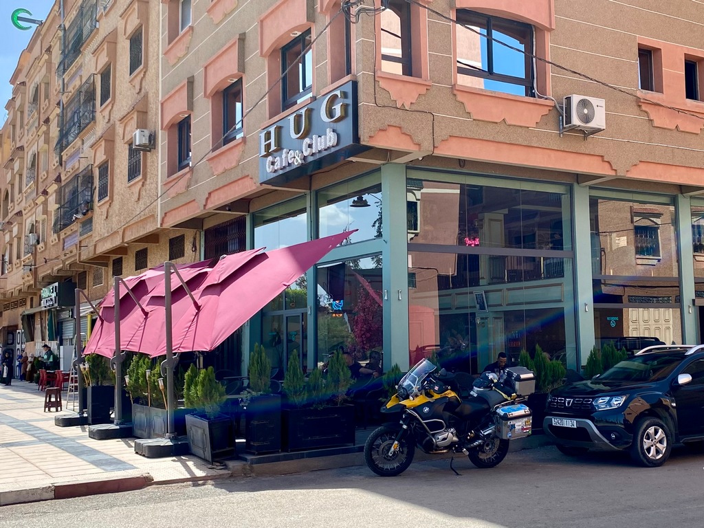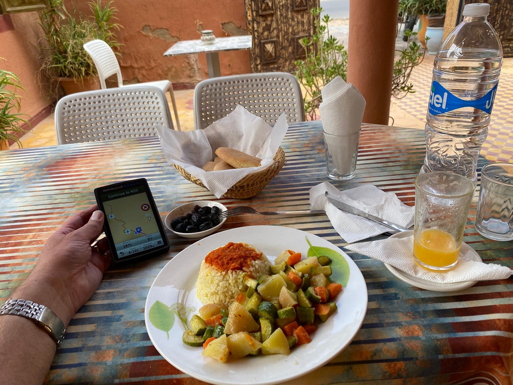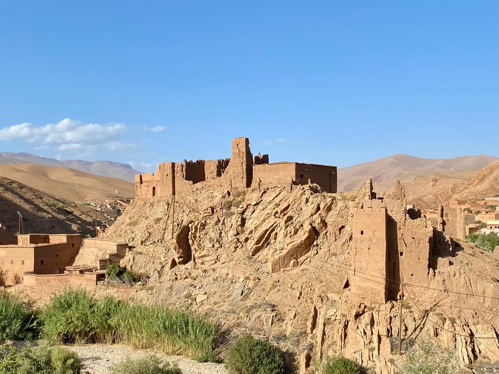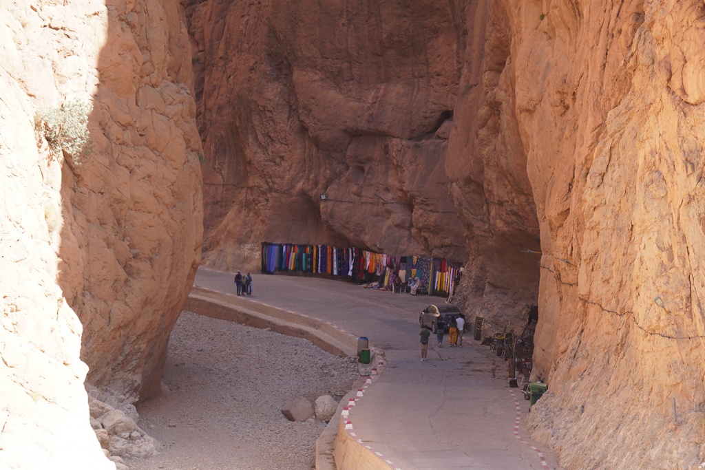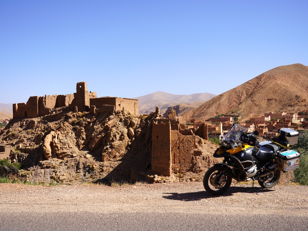 It was only a 2.5 hour ride from Meknes the Dar Zayane hotel outside of the town of Khenifra on Monday so I had a late start and took my time. I am sure a hotel out of town would be nice if you were on vacation and wanted to relax but for me it was just a bit boring as I like to go for a walk around town at supper time. Fortunately, I had stopped for lunch at the Hug Cafe and had a Nutella a crepe so got a bit of people watching in anyway. The Hug Cafe had it nailed down for the Nutella crepe as there was so much Nutella you couldn’t see the crepe. Perfect. Tuesday I rode towards the Todra Gorge via Imilchill in the High Atlas Mountains, topping out at Col de Tizi Tigherrhouzine at 2645m. Even Imilchill was at about 2,000 metres and I really enjoyed the ride with its sweeping corners. Then a steady down, culminating in the Todra Gorge. This gorge is really narrow, reminding me of the canyon coming out of Radium on Highway 93 in B.C. It would be really neat if it wasn’t crowded with souvenir sellers and tourists walking in the middle of the road but alas that wasn’t the case. It was another 100 km to my hotel at the base of the Dadès Gorge. There were lots of motorbikes today, even a group of Harley Davidson riders with Eagle Rider. I think I saw the same group of about 8 fancy adventure touring bikes (no luggage) twice. I suspect they were doing the Todra and Dadès gorges loop in a counterclockwise direction from a base in Dadès while I was going clockwise. I took a short trip up the famous switchbacks of the Dadès Gorge before backtracking to the hotel. I will take the Insta360 tomorrow morning to do some video. The host at the Maison d’Hote Argana was very friendly and welcoming. We sat out on the balcony with tea and cookies while filling in the appropriate paperwork before he showed me to my room with its own balcony overlooking the garden and Dadès River. A day of gorgeous gorges.Leaving through the gates that are part of the wall where the riad is located