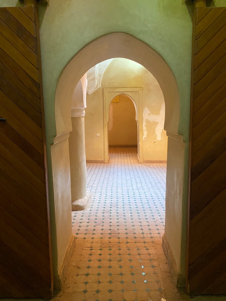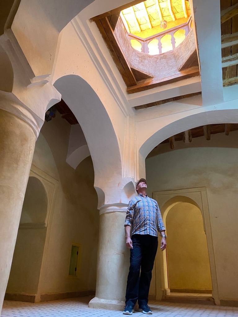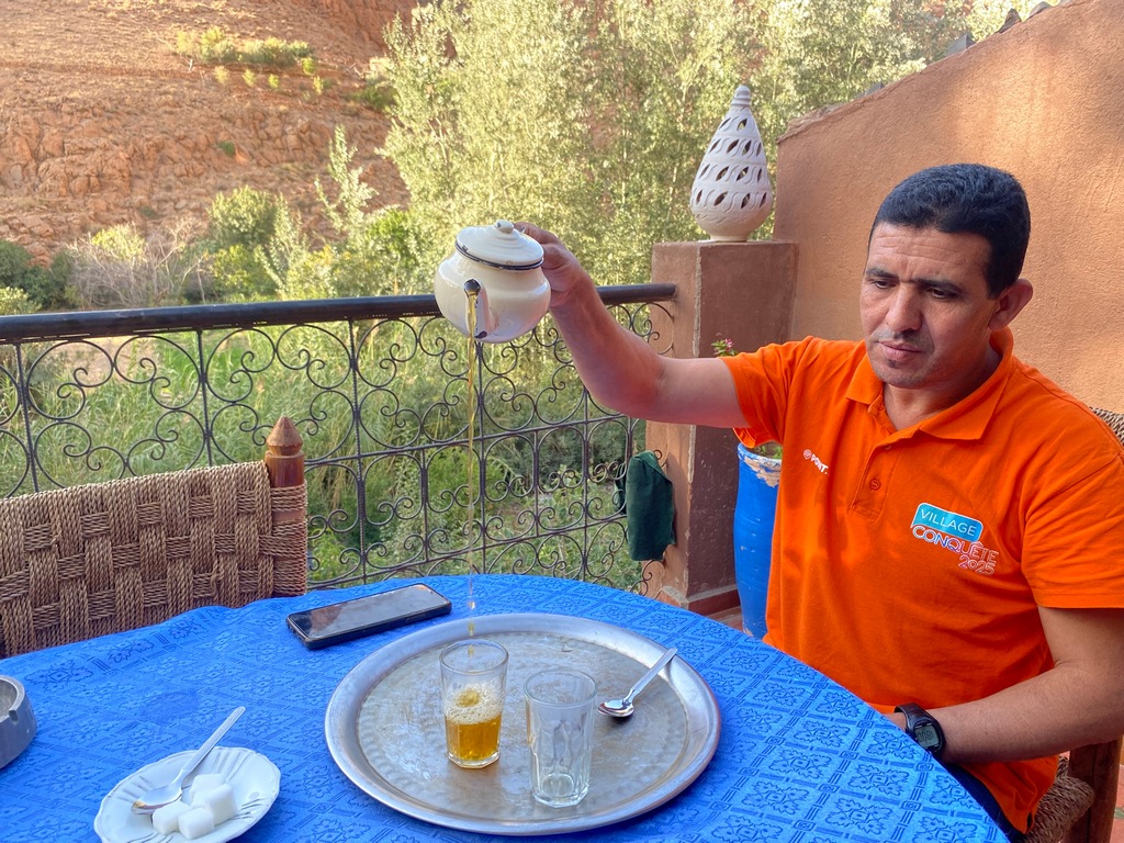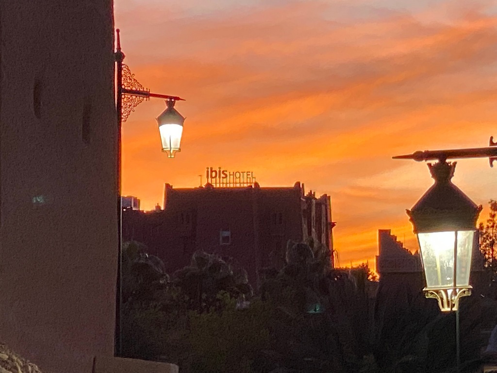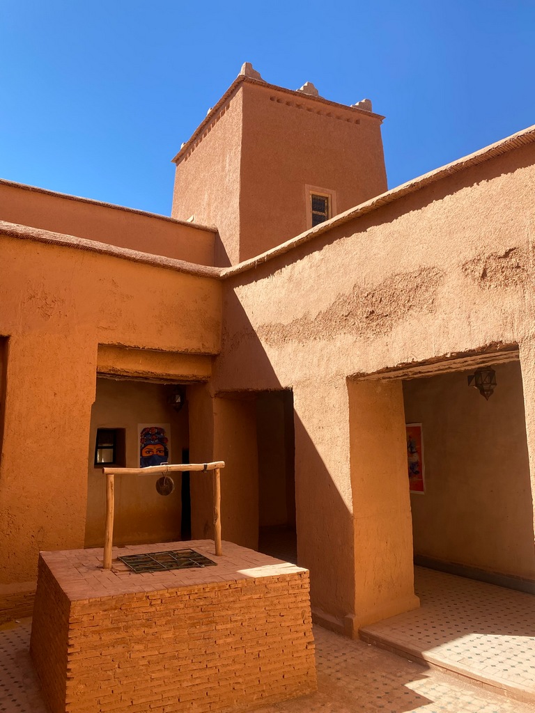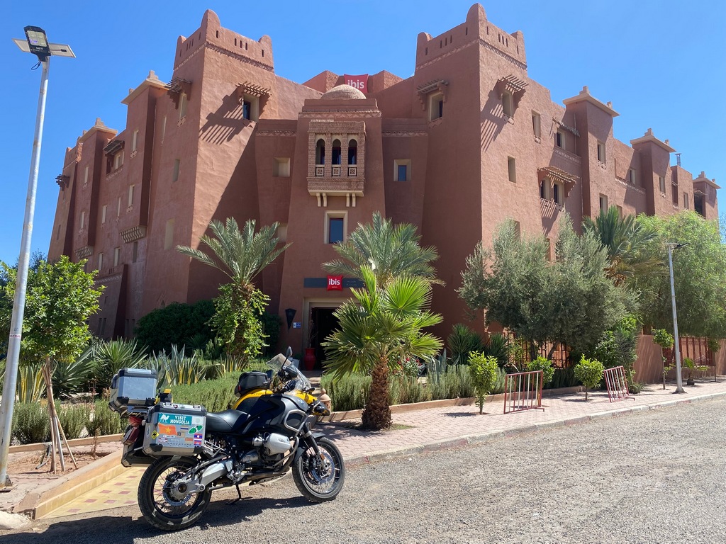 With only 4 switchbacks (compared to the Stelvio's 48 for example) the Dadès Gorge isn’t quite as challenging but it was a fun ride after pausing for a Moroccan tea at the top. Then down the Dadès River valley in the direction of Ouarzazate. Google maps suggested a parallel route through the desert that avoided all the small towns along the banks of the river. This really reminded me of the Nile where just a kilometre or two from the lush green banks of the river you were in wide open desert. I pulled into Ouarzazate (from the Berber meaning No (Ouar) noise (zazate)) and rode by the Kasbah de Taourirt before checking into the most spectacular ibis hotel. Still the same basic rooms on the inside as any other ibis but matching the local architecture on the outside. I walked back to the kasbah to have a look. A guide offered his services, but I initially declined. He persisted and it was worth the investment to hear the stories to bring the building to life. Mustafa was really involved in the film industry here so had lots of stories of that too. Ouarzazate was the scene for many films, ranging from Lawrence of Arabia to Gladiator. The kasbah was heavily damaged in the 2023 earthquake that shook the region, so half the building was closed and repairs were ongoing. Audrey and I had planned to come Ouarzazate in February 2003 but it was still too cold (below zero at night) and we skipped it so I am really glad I was finally able to make it here.Wow, the Dadès Gorge road from the restaurant at the top