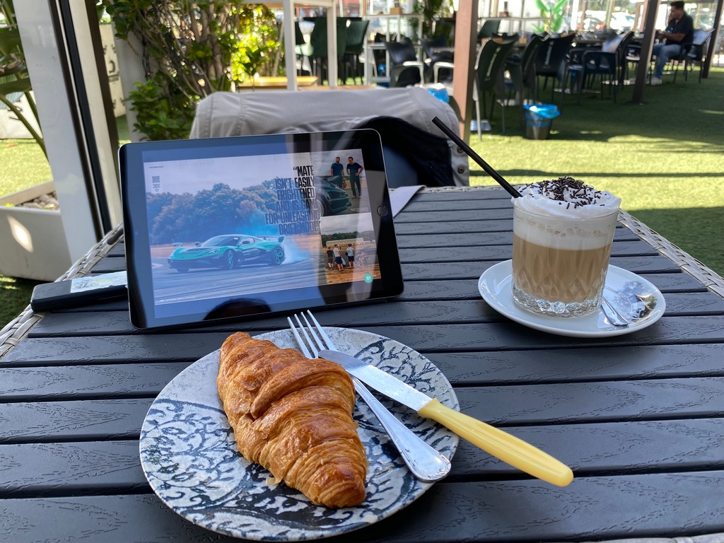 Waiting for the bike at the nearby Yamaha shop's cafe (cappuccino, chocolate croissant and Top Gear magazine)