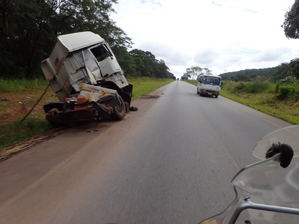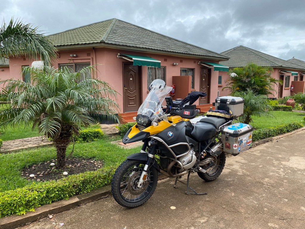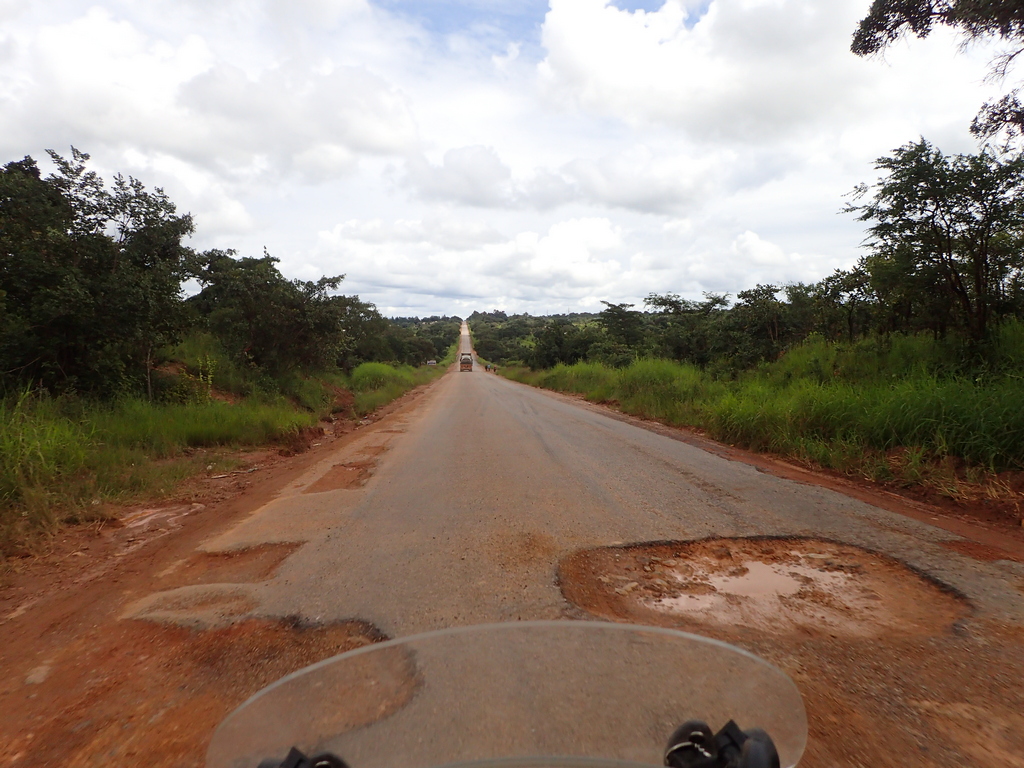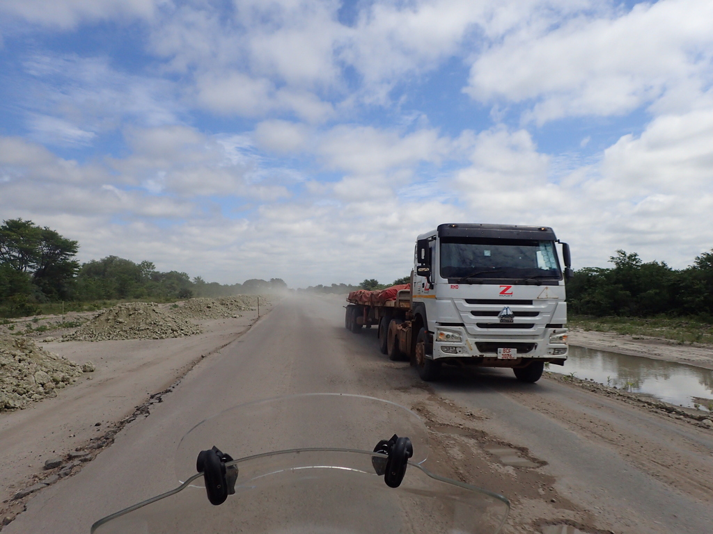 Sunday morning, I chatted with Johan Olivier, owner of the Land Cruiser pulling half a dozen BMWs on a trailer. He runs a South African tour company called Wild at Heart and he was bringing the bikes to Tanzania to run a tour. Our paths may cross over the next few days as I head to Tanzania as well. The riding was still nice when I left the Fika Lodge, on a good road with very little traffic. The reason for the lack of traffic became apparent before I got to Serenje. I came upon a queue of trucks several kilometres long. I passed the long line, ducking back into line when the occasional car came from the other direction. When I came upon the section where both lanes were jammed, I started squeezing the big BMW between the trucks and buses to get to the front. There I found a washout had created two enormous potholes (maybe a metre deep) blocking all traffic. People were filling one of the holes with sticks and stones and a couple of trucks had just started crawling across when I arrived. I crossed on the “bridge” between the holes and followed the trucks for several kilometres, stopping every now and again as an oncoming car blocked our progress. Finally we cleared the opposing queue and I passed the trucks with a clear road ahead. I gassed up in Serenje and emailed Johan to let him know of the blockage and struck out again on the Great North Road. From here the road became much more difficult to negotiate. The shoulders of the road were crumbling off with a sharp drop off and potholes, so the tarmac section narrowed down far enough that the trucks had difficulty passing each other. Soon I figured out a bit of a pattern, whenever I saw skid marks, I knew that there was a pothole coming up (the skid marks were from trucks slamming on the brakes to avoid the pothole or an oncoming truck also avoiding a pothole). On the motorcycle it was easy enough avoiding the potholes, but sometimes I would get stuck behind a truck weaving all over the road trying to negotiate their way through. Or oncoming traffic would suddenly veer onto my side of the road trying to avoid a huge hole. It made for slow going with the occasional heart stopping moment but eventually I made it to Mpika and the Northern Rock Lodge. I was initially told that they had no room for me (it looked like a conference was being held tomorrow) but while I was on my phone looking for alternatives suddenly one opened up. Yay! That certainly beat heading back into the rain. Later that evening I got a message from Johan saying that he arrived at about 8:00 PM, well after dark. He said he really missed his motorbike, and I could see why since I beat him here by about five hours.Johan is taking his tour company's bikes to Tanzania for a tour