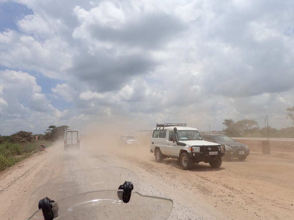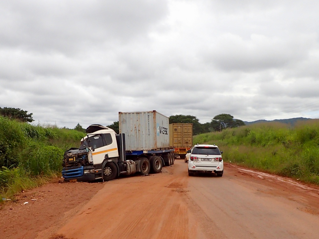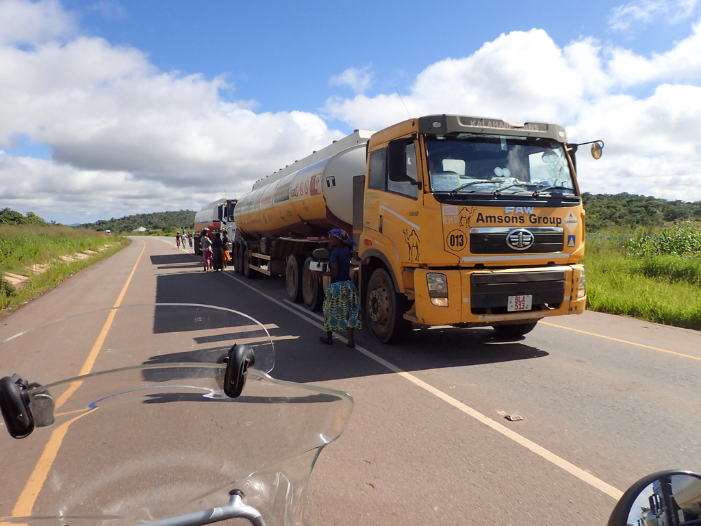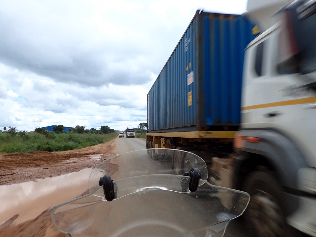 Sunday morning, I chatted with Johan Olivier, owner of the Land Cruiser pulling half a dozen BMWs on a trailer. He runs a South African tour company called Wild at Heart and he was bringing the bikes to Tanzania to run a tour. Our paths may cross over the next few days as I head to Tanzania as well. The riding was still nice when I left the Fika Lodge, on a good road with very little traffic. The reason for the lack of traffic became apparent before I got to Serenje. I came upon a queue of trucks several kilometres long. I passed the long line, ducking back into line when the occasional car came from the other direction. When I came upon the section where both lanes were jammed, I started squeezing the big BMW between the trucks and buses to get to the front. There I found a washout had created two enormous potholes (maybe a metre deep) blocking all traffic. People were filling one of the holes with sticks and stones and a couple of trucks had just started crawling across when I arrived. I crossed on the “bridge” between the holes and followed the trucks for several kilometres, stopping every now and again as an oncoming car blocked our progress. Finally we cleared the opposing queue and I passed the trucks with a clear road ahead. I gassed up in Serenje and emailed Johan to let him know of the blockage and struck out again on the Great North Road. From here the road became much more difficult to negotiate. The shoulders of the road were crumbling off with a sharp drop off and potholes, so the tarmac section narrowed down far enough that the trucks had difficulty passing each other. Soon I figured out a bit of a pattern, whenever I saw skid marks, I knew that there was a pothole coming up (the skid marks were from trucks slamming on the brakes to avoid the pothole or an oncoming truck also avoiding a pothole). On the motorcycle it was easy enough avoiding the potholes, but sometimes I would get stuck behind a truck weaving all over the road trying to negotiate their way through. Or oncoming traffic would suddenly veer onto my side of the road trying to avoid a huge hole. It made for slow going with the occasional heart stopping moment but eventually I made it to Mpika and the Northern Rock Lodge. I was initially told that they had no room for me (it looked like a conference was being held tomorrow) but while I was on my phone looking for alternatives suddenly one opened up. Yay! That certainly beat heading back into the rain. Later that evening I got a message from Johan saying that he arrived at about 8:00 PM, well after dark. He said he really missed his motorbike, and I could see why since I beat him here by about five hours.Johan is taking his tour company's bikes to Tanzania for a tour