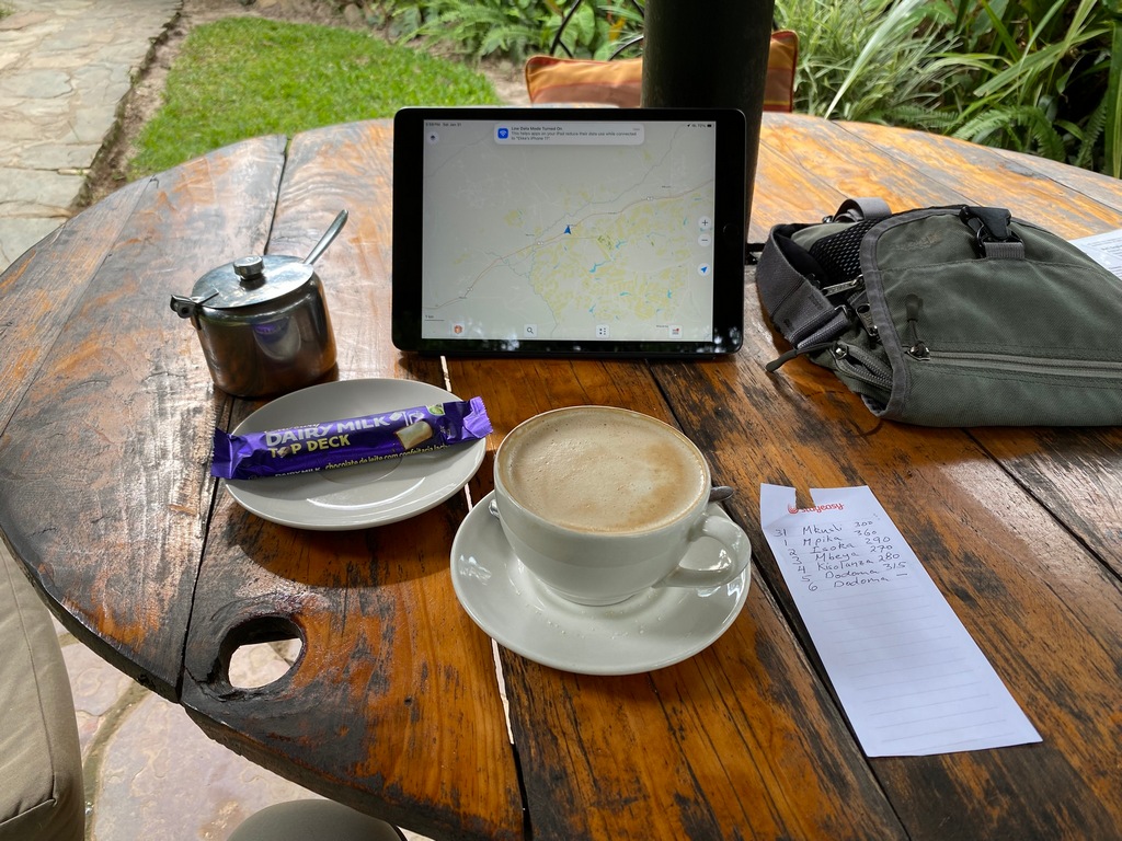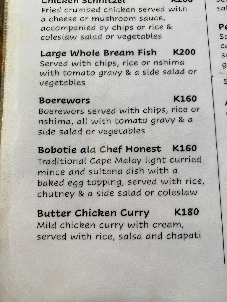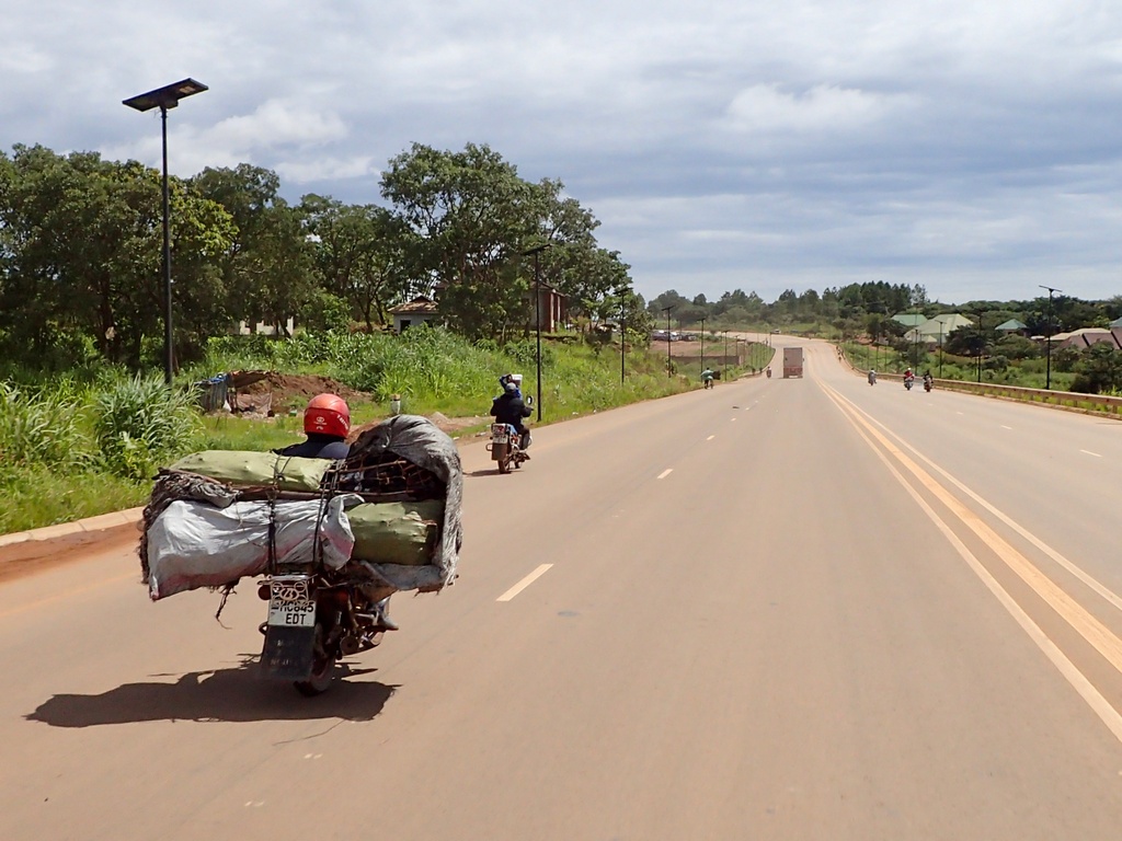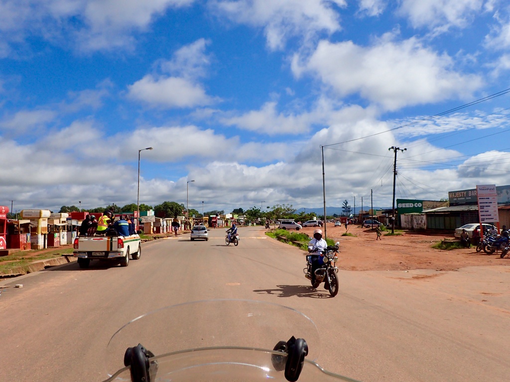 I left Lusaka on Saturday morning, going against the traffic heading into the city. Whenever there are predictable queues of traffic (like rush hour or at a speed bump) there will be people selling everything from bananas to popcorn to sunglasses. This allows you to reframe congestion. It isn’t so much a delay in your trip but a shopping opportunity. After a few shopping opportunities I was out of the core and heading north on a four-lane road that soon turned into a two-lane road with the other side being under construction. This went on for a couple of hours, all the way to Kabwe where I stopped at a Hungry Lion for an ice cream. At Mposhi, a little further north, the Great North Road turned east while the T3 continued north. Mposhi was especially hectic with truck traffic, but the traffic dropped off significantly when I left town and it was much more relaxed riding. Soon I pulled into the Fika Lodge, a spot that Heidi Van der Merwe had stopped at and really enjoyed. I relaxed in the restaurant with a cappuccino (more a cafe au lait) and a chocolate bar. For dinner I noticed bobotie on the menu, a dish that I make regularly at home from a Knorr package. The flavours were similar, but “my” (Knorr) recipe had a few different ingredients (like green beans and green apple) but it was fun having it in the “wild”.Heading out of Lusaka on Saturday morning